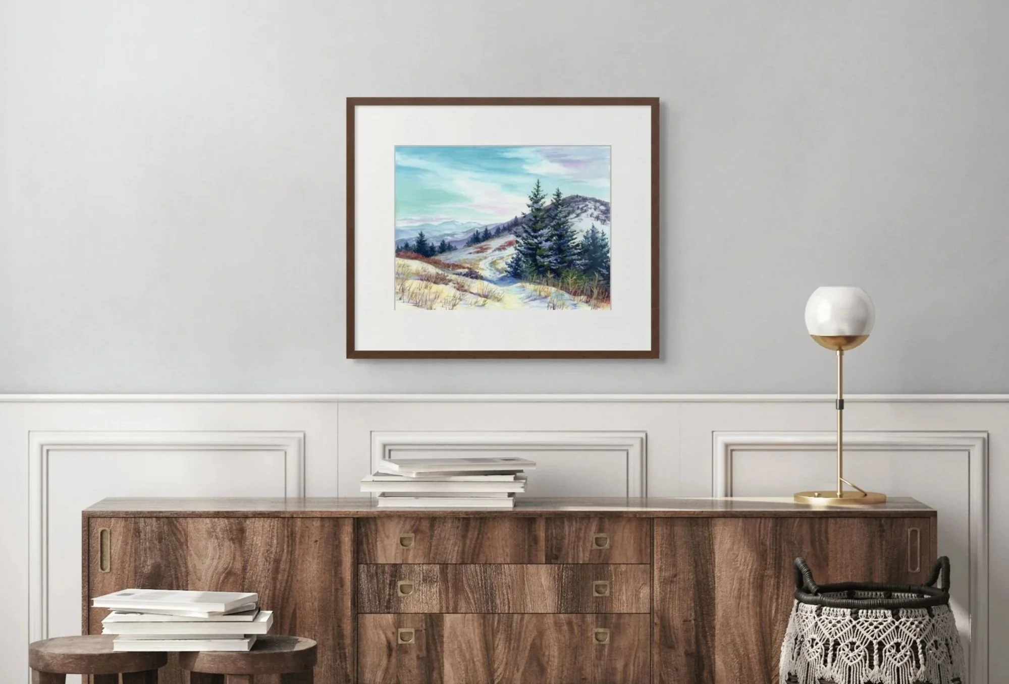 This is a painting of the Appalachian Trail near Carver’s Gap on the border of North Carolina and Tennessee. Feels like the top of the world. Vast views of mountains on each side of the ridge. The elements are rough here: harsh winter winds, ice and snow. But the beautiful views are worth the trip.